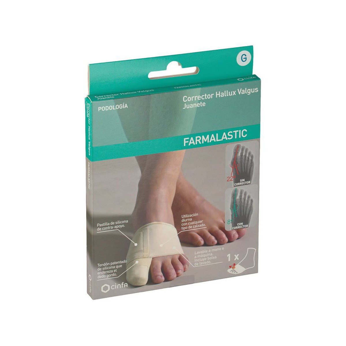 Corrector de Juanete, reduce la curvatura y alivia el roce y el dolor. 1 unidad Farmalastic Corrector de Juanete o Hallux valgus es una protección especial para el cuidado de los juanetes. Este corrector actúa gracias a su refuerzo lateral de silicona que actúa sobre el dedo gordo, enderezándolo y logrando corregir la curvatura asociada al juanete. Además, al ser este refuerzo lateral de silicona, también actúa sobre la piel, reduciendo el dolor y el roce que el juanete provoca debido principalmente al contacto con el calzado y de este modo se consigue una reducción del dolor. Se ha elaborado para que se emplee durante el día, de modo que corrige el hallux valgus mientras se camina. Este corrector de Juanete de Farmalastic es válido tanto para derecho como para izquierdo. Varias tallas, es